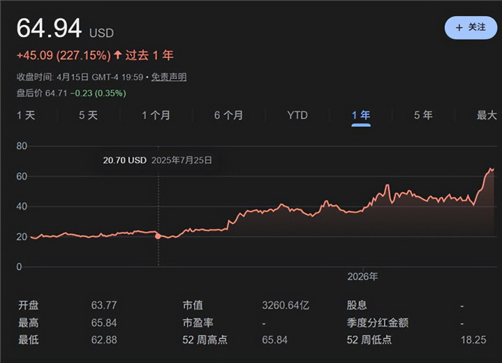 近期Intel股价连续上涨,其中不乏大涨,半个月涨幅就差不多50%,推动整体市值达到了3260亿美元,差不多是一年前的3倍,股价从20美元涨到了65美元,上涨227%之多。